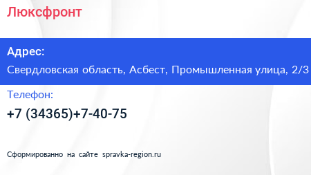 Люксфронт по адресу Свердловская область, Асбест, Промышленная улица, 2/3 в дальнейшем Организация, размещена в следующих категориях:
