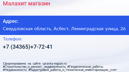 Малахит, магазин по адресу Свердловская область, Асбест, Ленинградская улица, 26 в дальнейшем Организация, размещена в следующих категориях:
