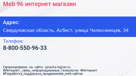 Meb 96, интернет-магазин по адресу Свердловская область, Асбест, улица Челюскинцев, 34 в дальнейшем Организация, размещена в следующих категориях: