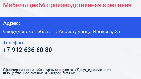 Мебельщик66, производственная компания по адресу Свердловская область, Асбест, улица Войкова, 2а в дальнейшем Организация, размещена в следующих категориях: