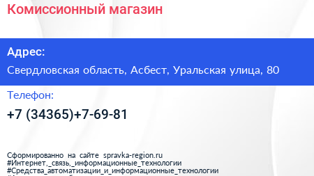 Комиссионный магазин по адресу Свердловская область, Асбест, Уральская улица, 80 в дальнейшем Организация, размещена в следующих категориях: