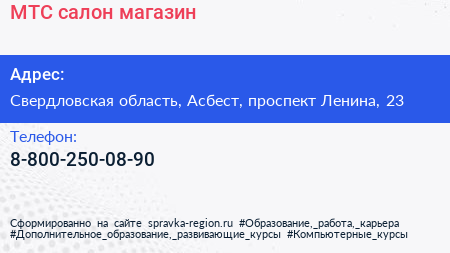 МТС, салон-магазин по адресу Свердловская область, Асбест, проспект Ленина, 23 в дальнейшем Организация, размещена в следующих категориях:
