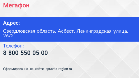 Мегафон по адресу Свердловская область, Асбест, Ленинградская улица, 26/2 в дальнейшем Организация, размещена в следующих категориях: