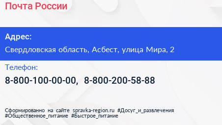 Почта России по адресу Свердловская область, Асбест, улица Мира, 2 в дальнейшем Организация, размещена в следующих категориях:
