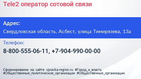 Tele2, оператор сотовой связи по адресу Свердловская область, Асбест, улица Тимирязева, 13а в дальнейшем Организация, размещена в следующих категориях: