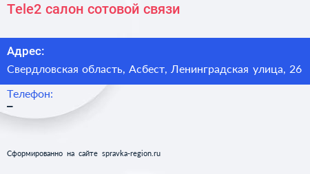 Tele2, салон сотовой связи по адресу Свердловская область, Асбест, Ленинградская улица, 26 в дальнейшем Организация, размещена в следующих категориях: