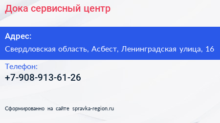 Дока, сервисный центр по адресу Свердловская область, Асбест, Ленинградская улица, 16 в дальнейшем Организация, размещена в следующих категориях: