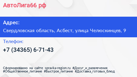 АвтоЛига66.рф по адресу Свердловская область, Асбест, улица Челюскинцев, 9 в дальнейшем Организация, размещена в следующих категориях: