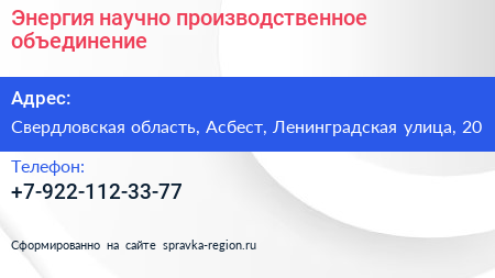 Энергия, научно-производственное объединение по адресу Свердловская область, Асбест, Ленинградская улица, 20 в дальнейшем Организация, размещена в следующих категориях: