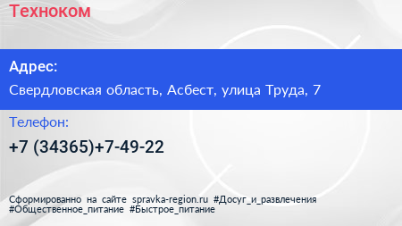 Техноком по адресу Свердловская область, Асбест, улица Труда, 7 в дальнейшем Организация, размещена в следующих категориях: