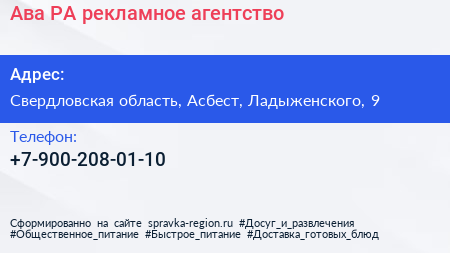 Ава-РА, рекламное агентство по адресу Свердловская область, Асбест, Ладыженского, 9 в дальнейшем Организация, размещена в следующих категориях: