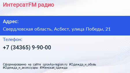 ИнтерсатFM, радио по адресу Свердловская область, Асбест, улица Победы, 21 в дальнейшем Организация, размещена в следующих категориях: