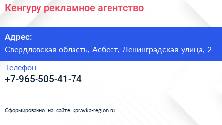 Кенгуру, рекламное агентство по адресу Свердловская область, Асбест, Ленинградская улица, 2 в дальнейшем Организация, размещена в следующих категориях:
