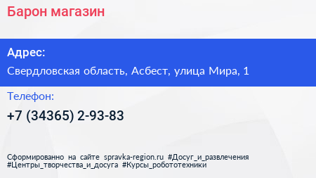 Барон, магазин по адресу Свердловская область, Асбест, улица Мира, 1 в дальнейшем Организация, размещена в следующих категориях: