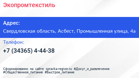 Экопромтекстиль по адресу Свердловская область, Асбест, Промышленная улица, 4а в дальнейшем Организация, размещена в следующих категориях: