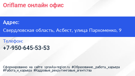 Oriflame, онлайн-офис по адресу Свердловская область, Асбест, улица Пархоменко, 9 в дальнейшем Организация, размещена в следующих категориях: