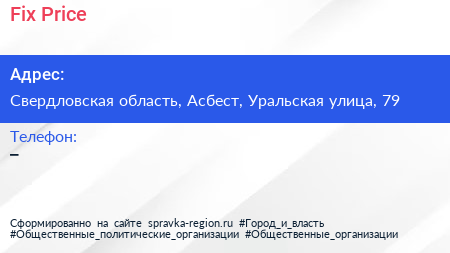Fix Price по адресу Свердловская область, Асбест, Уральская улица, 79 в дальнейшем Организация, размещена в следующих категориях: