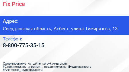 Fix Price по адресу Свердловская область, Асбест, улица Тимирязева, 13 в дальнейшем Организация, размещена в следующих категориях: