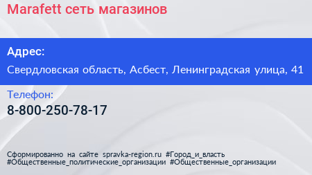 Marafett, сеть магазинов по адресу Свердловская область, Асбест, Ленинградская улица, 41 в дальнейшем Организация, размещена в следующих категориях: