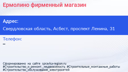 Ермолино, фирменный магазин по адресу Свердловская область, Асбест, проспект Ленина, 31 в дальнейшем Организация, размещена в следующих категориях: