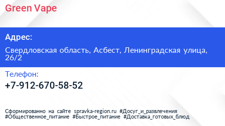 Green Vape по адресу Свердловская область, Асбест, Ленинградская улица, 26/2 в дальнейшем Организация, размещена в следующих категориях: