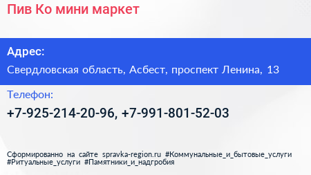 Пив & Ко, мини-маркет по адресу Свердловская область, Асбест, проспект Ленина, 13 в дальнейшем Организация, размещена в следующих категориях: