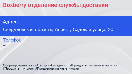 Boxberry, отделение службы доставки по адресу Свердловская область, Асбест, Садовая улица, 20 в дальнейшем Организация, размещена в следующих категориях: