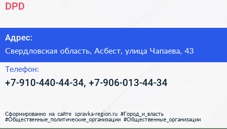 DPD по адресу Свердловская область, Асбест, улица Чапаева, 43 в дальнейшем Организация, размещена в следующих категориях: