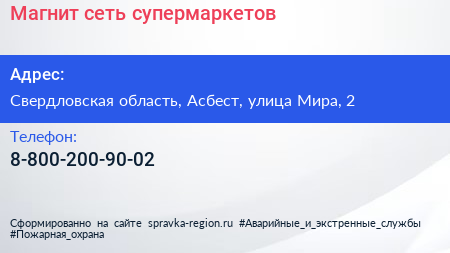 Магнит, сеть супермаркетов по адресу Свердловская область, Асбест, улица Мира, 2 в дальнейшем Организация, размещена в следующих категориях: