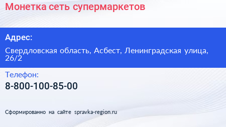 Монетка, сеть супермаркетов по адресу Свердловская область, Асбест, Ленинградская улица, 26/2 в дальнейшем Организация, размещена в следующих категориях: