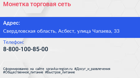 Монетка, торговая сеть по адресу Свердловская область, Асбест, улица Чапаева, 33 в дальнейшем Организация, размещена в следующих категориях: