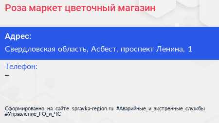 Роза маркет, цветочный магазин по адресу Свердловская область, Асбест, проспект Ленина, 1 в дальнейшем Организация, размещена в следующих категориях: