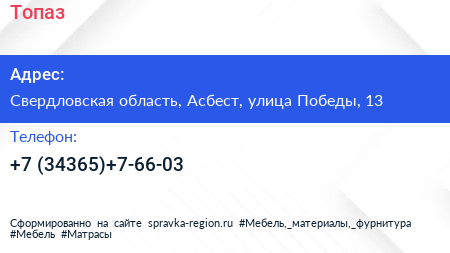 Топаз по адресу Свердловская область, Асбест, улица Победы, 13 в дальнейшем Организация, размещена в следующих категориях: