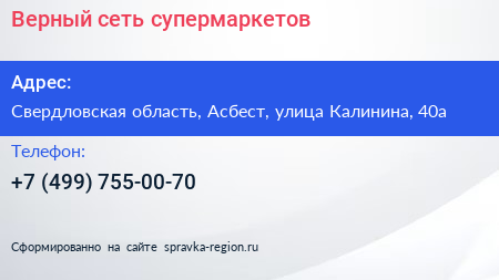 Верный, сеть супермаркетов по адресу Свердловская область, Асбест, улица Калинина, 40а в дальнейшем Организация, размещена в следующих категориях: