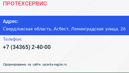 ПРОТЕХСЕРВИС по адресу Свердловская область, Асбест, Ленинградская улица, 26 в дальнейшем Организация, размещена в следующих категориях: