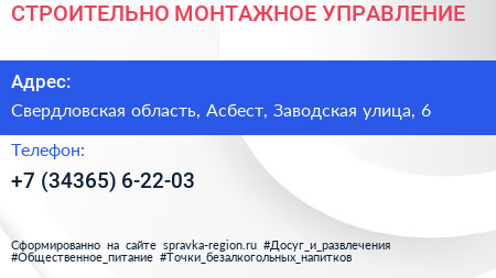 СТРОИТЕЛЬНО-МОНТАЖНОЕ УПРАВЛЕНИЕ по адресу Свердловская область, Асбест, Заводская улица, 6 в дальнейшем Организация, размещена в следующих категориях: