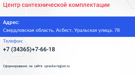 Центр сантехнической комплектации по адресу Свердловская область, Асбест, Уральская улица, 78 в дальнейшем Организация, размещена в следующих категориях: