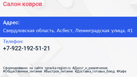 Салон ковров по адресу Свердловская область, Асбест, Ленинградская улица, 41 в дальнейшем Организация, размещена в следующих категориях: