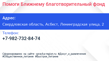 Помоги Ближнему, благотворительный фонд по адресу Свердловская область, Асбест, Ленинградская улица, 2 в дальнейшем Организация, размещена в следующих категориях:
