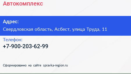 Автокомплекс по адресу Свердловская область, Асбест, улица Труда, 11 в дальнейшем Организация, размещена в следующих категориях: