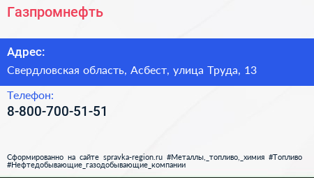Газпромнефть по адресу Свердловская область, Асбест, улица Труда, 13 в дальнейшем Организация, размещена в следующих категориях: