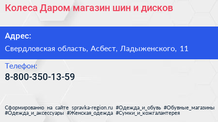 Колеса Даром, магазин шин и дисков по адресу Свердловская область, Асбест, Ладыженского, 11 в дальнейшем Организация, размещена в следующих категориях: