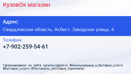 КузовОк, магазин по адресу Свердловская область, Асбест, Заводская улица, 4 в дальнейшем Организация, размещена в следующих категориях: