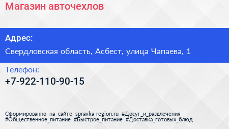 Магазин авточехлов по адресу Свердловская область, Асбест, улица Чапаева, 1 в дальнейшем Организация, размещена в следующих категориях: