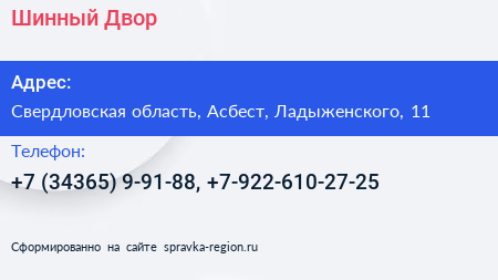 Шинный Двор по адресу Свердловская область, Асбест, Ладыженского, 11 в дальнейшем Организация, размещена в следующих категориях: