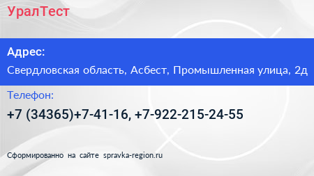 УралТест по адресу Свердловская область, Асбест, Промышленная улица, 2д в дальнейшем Организация, размещена в следующих категориях: