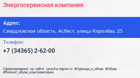 Энергосервисная компания по адресу Свердловская область, Асбест, улица Королёва, 25 в дальнейшем Организация, размещена в следующих категориях: