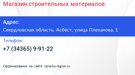 Магазин строительных материалов по адресу Свердловская область, Асбест, улица Плеханова, 1 в дальнейшем Организация, размещена в следующих категориях: