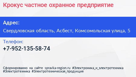 Крокус, частное охранное предприятие по адресу Свердловская область, Асбест, Комсомольская улица, 5 в дальнейшем Организация, размещена в следующих категориях: