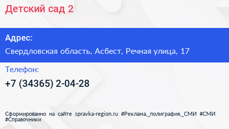 Детский сад №2 по адресу Свердловская область, Асбест, Речная улица, 17 в дальнейшем Организация, размещена в следующих категориях: